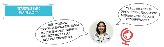 当課は購買部門の中でも業務範囲が広い部署です。 まずは商品を構成する部品のコスト管理です。サプライヤー様の提案内容を精査し、見積もりや立ち上げ、そして量産品になるまでの日程管理などを行っています。そのために品質・デリバリー・コストの面から新規サプライヤーの開拓や既存サプライヤーの選定をすることも大きな業務の一つです。新商品やモデルチェンジに対し、開発部門の要望や時代のニーズに合ったサプライヤー様を探求しています。