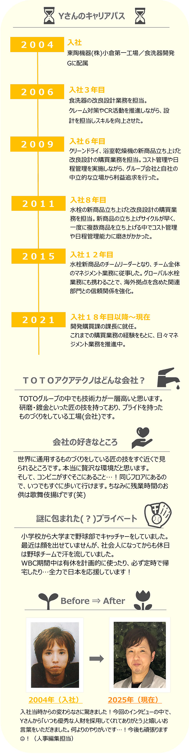 そして、サプライヤー様からの価格変更や部品の詳細変更への対応など、CR(コストリダクション)活動も行っています。サプライヤー様の立場を理解し、当社ファーストではなく中立の立ち位置で推進することが大切な業務です。当社商品の7~8割はサプライヤー様からの部品供給で成り立っているため、質の高い商品もサプライヤー様の力なくしては出来上がりません。サプライヤー様のご相談を受けながら開発部門の要望を協議したり、反対にサプライヤー様へ厳しい条件でのご依頼をしなければならなかったりと、一方的な交渉ではないため、中立であることが重要と言えます。紹介した業務はほんの一部ですが、私たちの役割は 『TOTOアクアテクノとサプライヤー様の架け橋』 だと思っています。